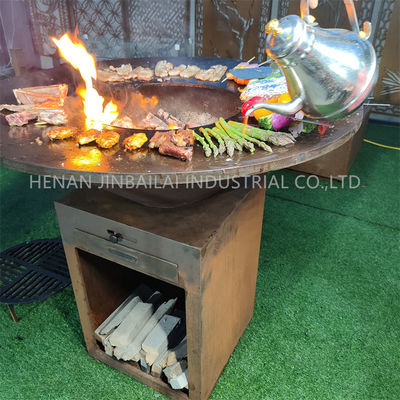The cone-shaped hearth is rimmed with a steel rim in the form of a narrow top, which is heated from the inside of the hearth to grill, cook, fry and heat. The large working space of the plate allows you to conveniently prepare various types of dishes for up to 40 people. The shape of the grill encourages you to gather around the hearth, jointly prepare and celebrate meals outdoors throughout the year.Customized BBQ Fire Table With Center Grate is made with good quality weathering corten steel material, you can adjust the BBQ Grill height according to your need, this is very easy and convenient to realize.Prepare a healthy meal outside with this Fire Bowl has a round wide, thick flat roasting plate that you use as teppanyaki. The roasting plate has different cooking temperatures. The centre of the plate is warmer as the outer sides so cooking is even easier and all ingredients can be served together. The Grill is beautifully designed and creates a special experience of cooking in an atmospheric way together with your guests. Whether you are baking eggs, slowly cooking vegetables, grilling a tender steak or preparing a fish meal, with the Grill you discover a completely new world full of possibilities for outdoor cooking. You can grill and bake at the same time thanks to the included BBQ grill.